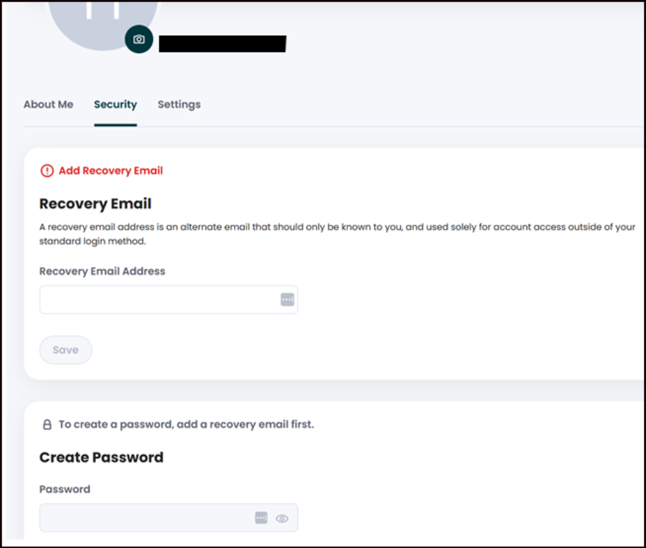 Click your Profile then click on the Security tab to enter your Recovery Email and Password: